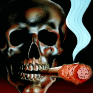 An animated painting of a skull smoking a cigar, with smoke rising.