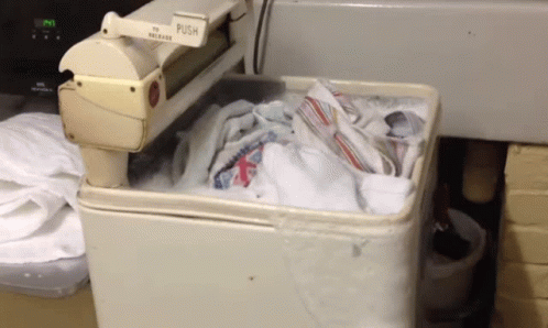 A person washes clothes in an old-fashioned wringer washing machine, filled with soapy water and laundry.