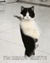 Skynet Skyboy, the dancing cat, stands on its hind legs with the caption 'I'M READY BRETT!'