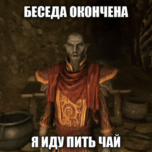 A character from Skyrim states 'Conversation over, I'm going to drink tea' and walks away.