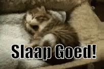An adorable kitten is seen sleeping peacefully, with the Dutch text 'Slaap Goed!' visible.