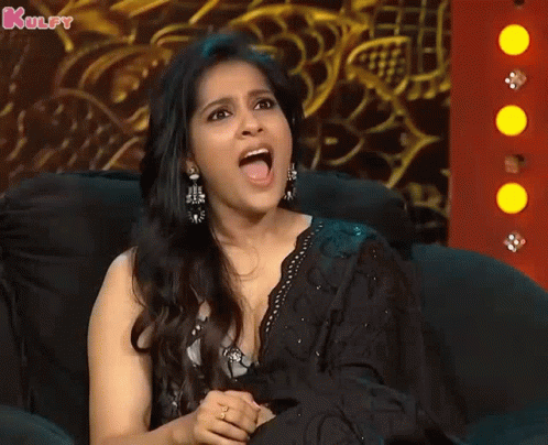 Rashmi's expressive reaction on a couch, first shouting then shrugging dismissively.