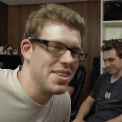 Corey Vidal smiles, preparing to slap, as friends react in the background.