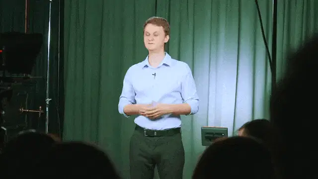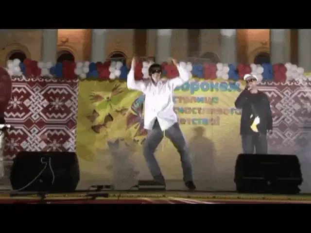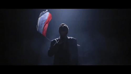 Slava KPSS and Gnoyny perform dramatically in a suit, with a Russian flag waving in the background.