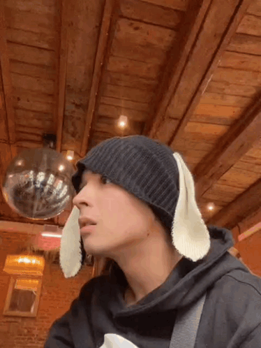 Slava Marlow smiles, wearing a black beanie with white bunny ears in a cozy wooden setting.