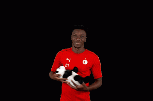 Slavia Praha football player Traore holding a cute panda plush toy.