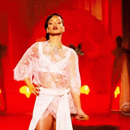 Rihanna, the 'Slayage Queen,' poses confidently on stage in a stunning white lace outfit with a red backdrop.
