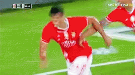 Danilo of SL Benfica scores a goal and celebrates by sliding on the field in his red number 33 jersey.