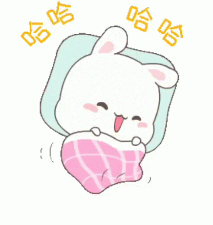 A cute cartoon bunny laughs happily while snuggled in a pink checkered blanket, with 'Haha' text floating around.