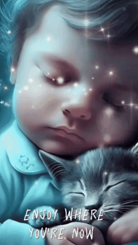 A peaceful scene of a child sleeping soundly with a kitten, wishing 'Sleep Well, Sleep Tight'.