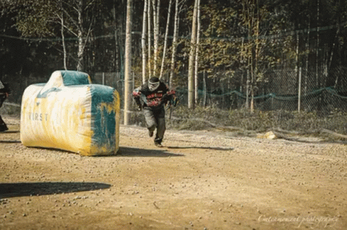 A paintball player in full gear slides across the dirt field during a game, approaching a bunker.
