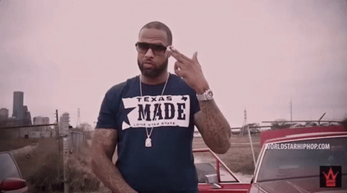 Slim Thug posing in a 'Texas Made' shirt, making a hand gesture, with a red car in the background.