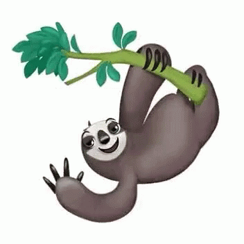 A cheerful cartoon sloth hangs from a tree branch, smiling and waving hello.