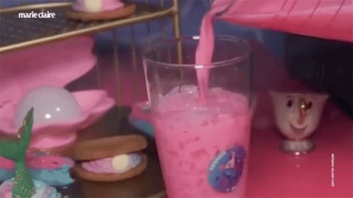 Vibrant pink and white liquids are poured into a glass to create a colorful mermaid-inspired slushie.
