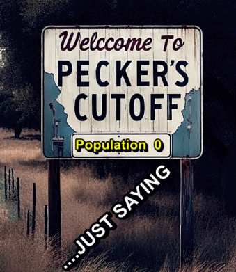 A humorous road sign welcomes visitors to Pecker's Cutoff, stating a population of zero, with a clear message: '...Just Saying'.