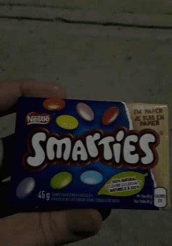 A hand holds a box of Nestle Smarties candy, showcasing the colorful chocolate treats.