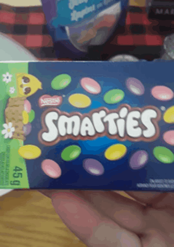 A hand holds a box of Nestle Smarties candy, featuring colorful candy pieces on the packaging.