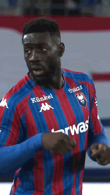 Alexandre Mendy, a soccer player for SM Caen, celebrates during a match, wearing his team's striped jersey.