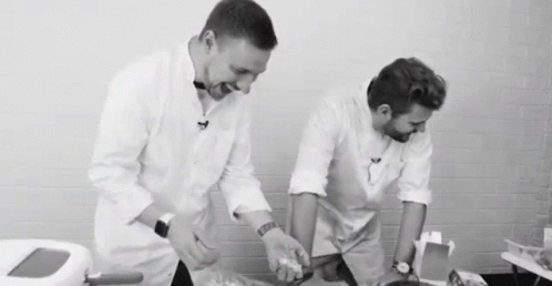 Kostya Pavlov and Max Brandt burst into laughter while working in white coats.