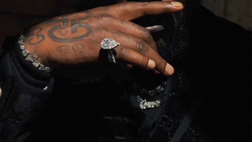 Gucci Mane's hand with a large diamond ring and 'GG' tattoo, showcasing his iced-out style.