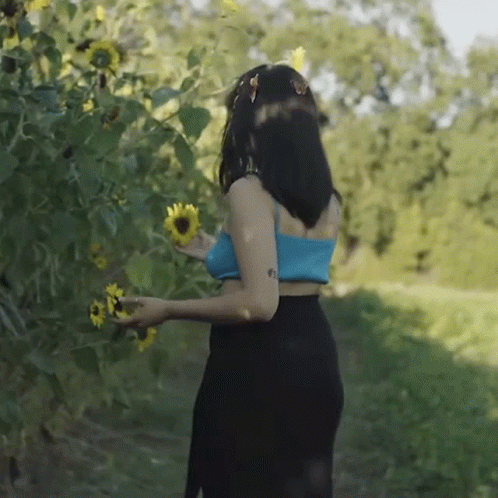 Brianda Brond Goyos Leon enjoys the scent of sunflowers in a sunny field.