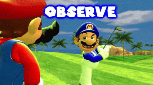 Smg4's Mario character in a blue outfit holds a golf club, with 'OBSERVE' text displayed above him.