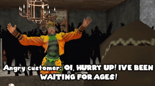 An SMG4 character, an angry customer, shouts 'Oi, Hurry Up! I've been waiting for ages!' in a crowded room.