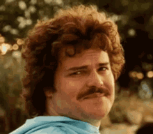 A man with curly reddish-brown hair and a mustache smiles warmly while wearing a light blue hoodie.