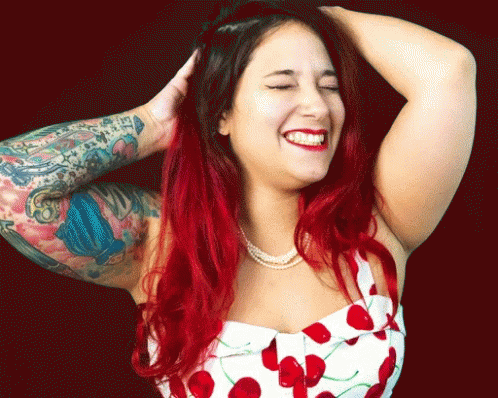 Lita, with vibrant red hair and tattoos, smiles playfully while wearing a cherry-patterned top.