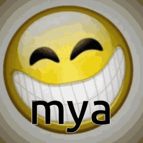 Animated yellow smiley face emoji with a wide grin and the word 'mya' displayed below it.