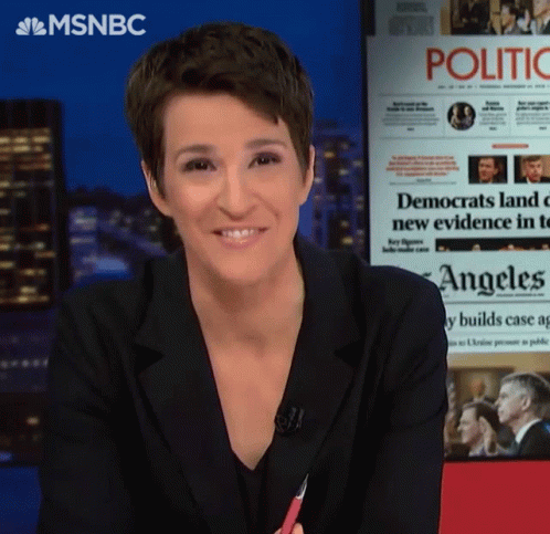 Rachel Maddow, MSNBC anchor, smiles and nods while on air, presenting news and engaging with the audience.