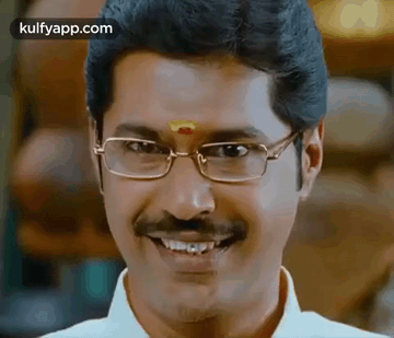 Subbu Panchu's iconic golden smile from the movie Kalakalappu, wearing glasses and a mustache.