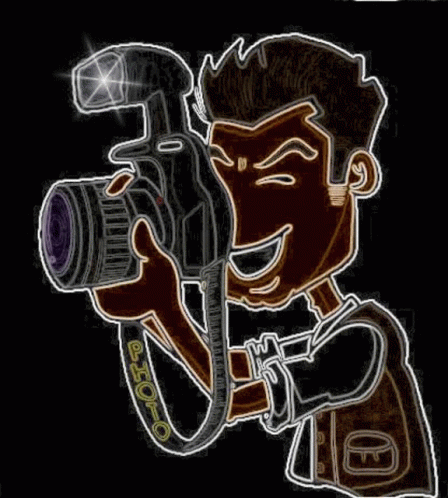 A vibrant cartoon illustration of a smiling photographer holding a camera with a bright flash, ready to capture a moment.