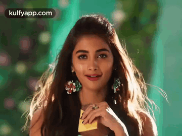 Pooja Hegde smiling brightly, holding a small golden object, radiating joy and charm.