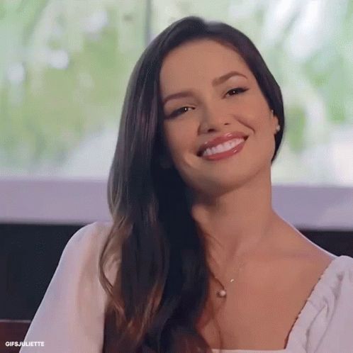 Juliette Freire with long dark hair, wearing a white top, smiles sweetly at the camera.