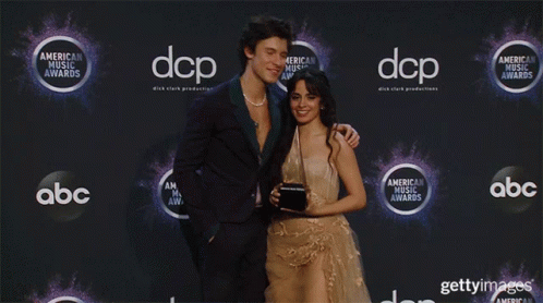 Shawn Mendes and Camila Cabello pose happily with their American Music Award trophy at the AMAs 2019.