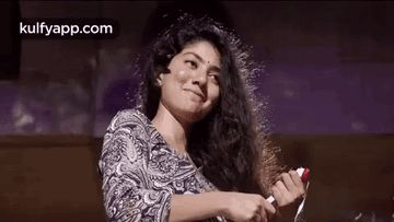 Sai Pallavi smiling happily while brushing her long, curly hair, exuding a cheerful vibe.