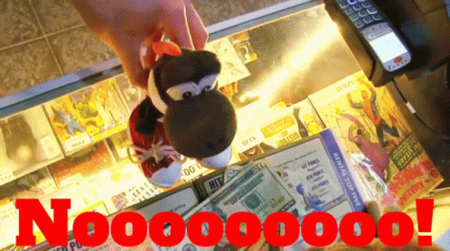 SML Black Yoshi plush toy is held up, exclaiming 'Nooooooooo!' in a store setting.