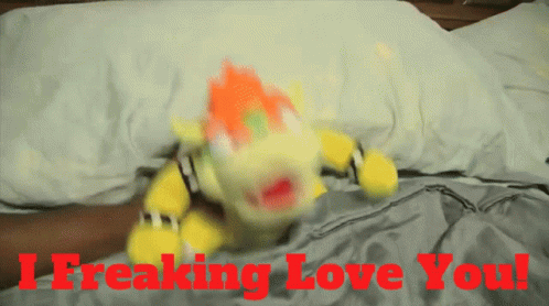 SML Bowser plush toy on a bed, with the text 'I Freaking Love You!' displayed prominently.