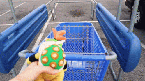 SML's Bowser Junior plush being pushed in a shopping cart towards a cart return at Sears.