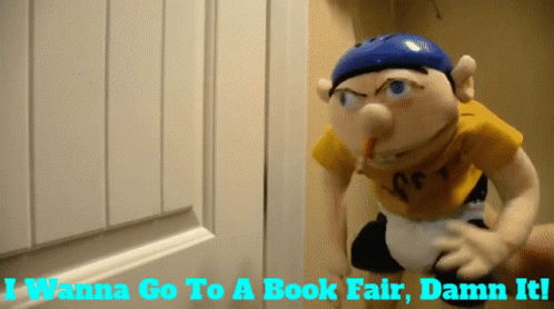 SML character Jeffy, a puppet in a yellow shirt and blue hat, emphatically states his desire for a book fair.