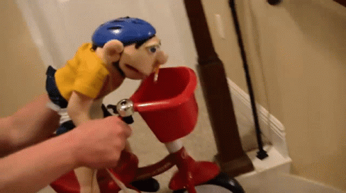 SML's Jeffy puppet rides a red tricycle, performing a wheelie with assistance.