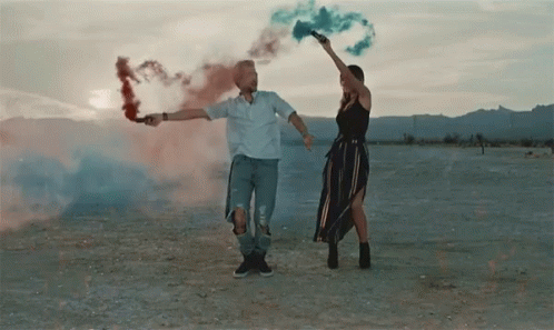 Mando and a woman holding red and blue smoke grenades, creating colorful smoke trails in a desert landscape.