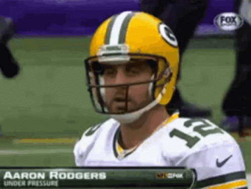 Aaron Rodgers makes a 'smoker' gesture while wearing his Green Bay Packers uniform, appearing to be under pressure.