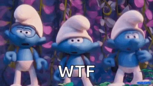 The Smurfs react with surprise and fear, accompanied by the text 'WTF' in this movie clip.