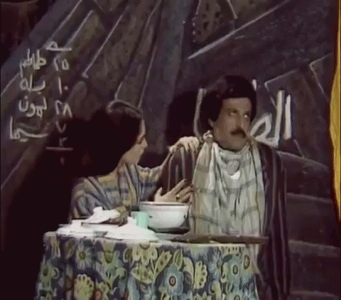 Samir Ghanem, Sherin, and Lina Masoudi in a comedic scene from the classic Egyptian play 'Al Motazaougoun' (The Married Ones).
