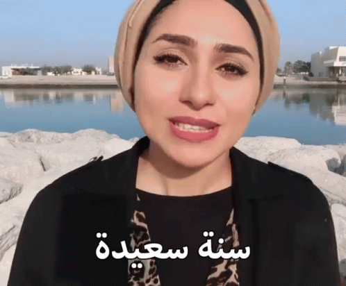 Zainab Al Eqabi wishes a Happy New Year, smiling brightly by the water while wearing a stylish turban.