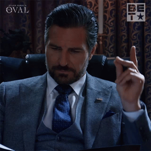 Hunter Franklin (Ed Quinn) snaps his fingers while sitting in a suit and tie in an office setting.