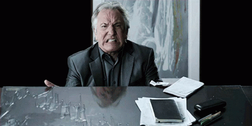 Snape, a man in a suit, angrily flips a table in a fit of rage.