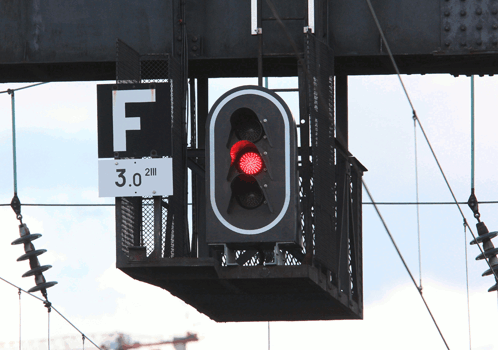 A red railway signal with an 'F' and '3.0' sign, indicating a stop for SNCF trains.